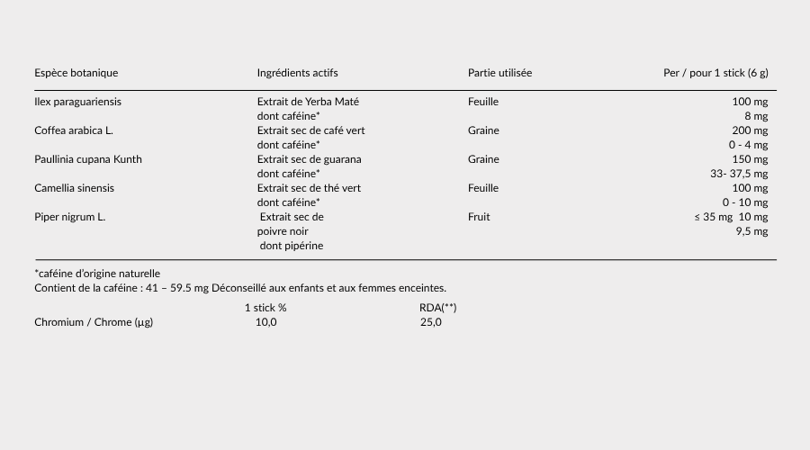 Riche en caféine d’origine naturelle, ce complément procure un effet tonifiant idéal pour accompagner les dépenses énergétiques tout au long de la journée, sans provoquer de nervosité excessive. Le chrome, présent dans la formule, contribue au maintien d’une glycémie normale et aide à limiter les fringales.