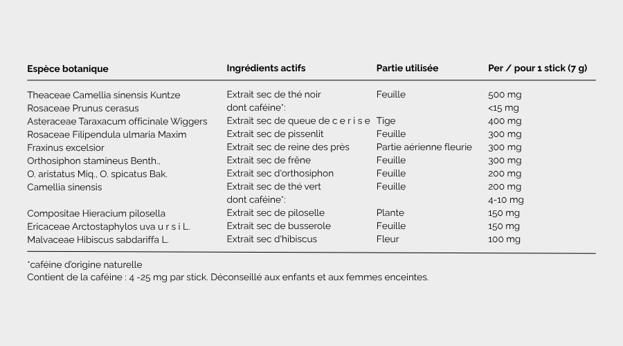Grâce à sa teneur modérée en caféine d’origine naturelle (4 à 25 mg par stick), il aide à activer en douceur le métabolisme sans effet excitant. Chaque ingrédient agit en synergie pour favoriser l’élimination rénale, drainer les toxines et affiner visiblement la silhouette.